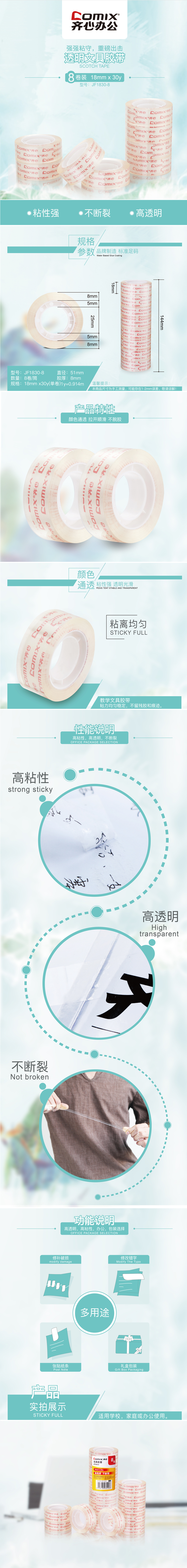 商品名称:齐心 JF1830-8 超透文具胶带 8卷/筒 18mm*30y