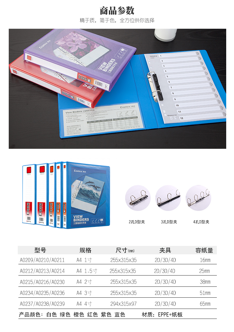 商品名称:齐心 A0215 易展示 美式三面插袋文件夹 A4 2寸2孔D型夹