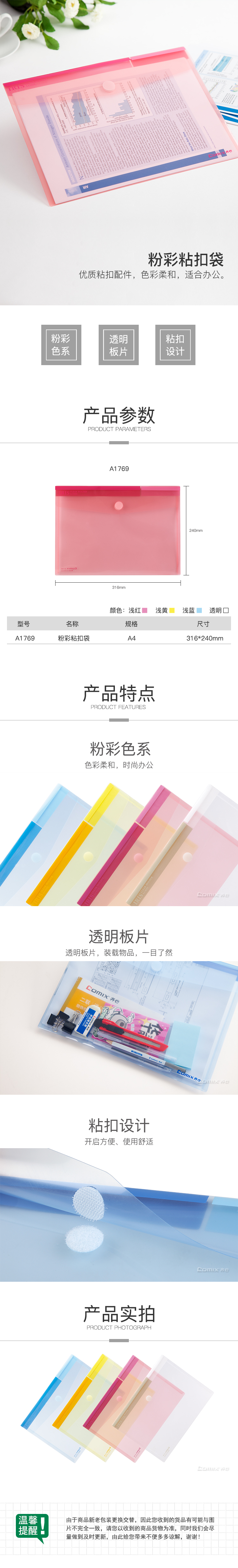 商品名称:齐心 A1769 粉彩粘扣袋 A4